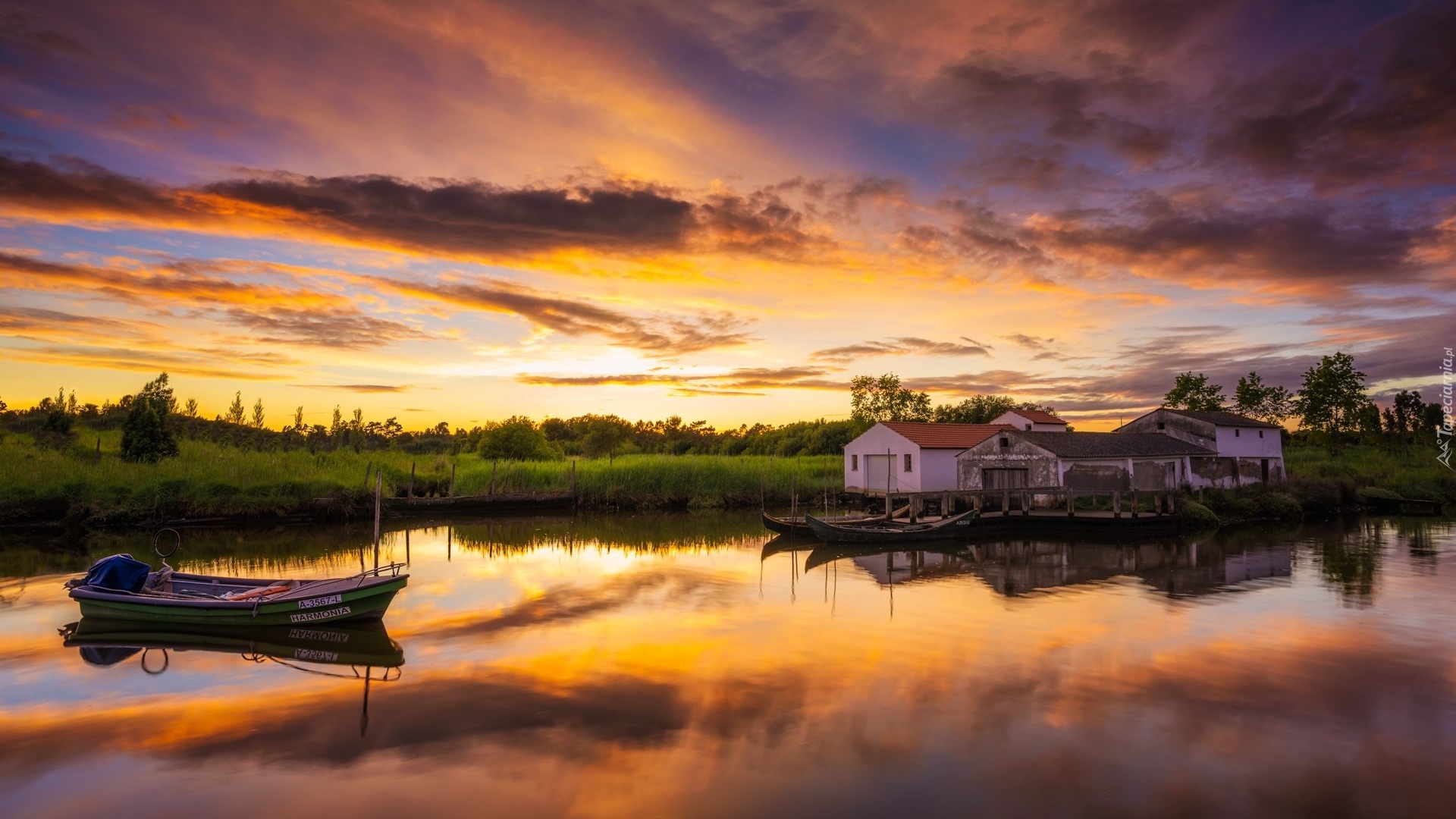 Edytor tapety: Łódki i domy nad jeziorem pod kolorowym niebem