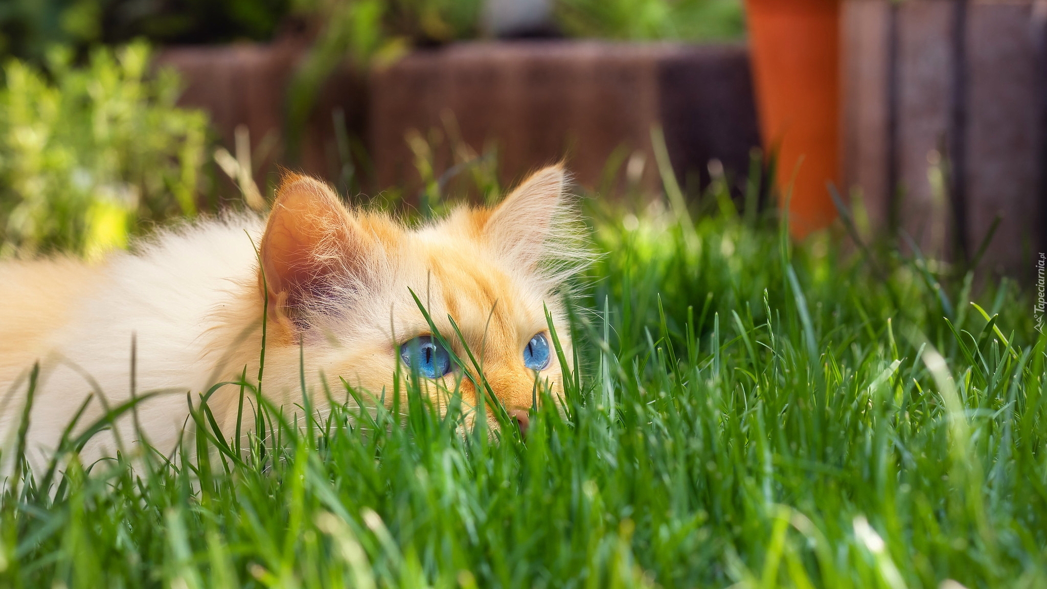 Edytor tapety: Przyczajony kot w trawie