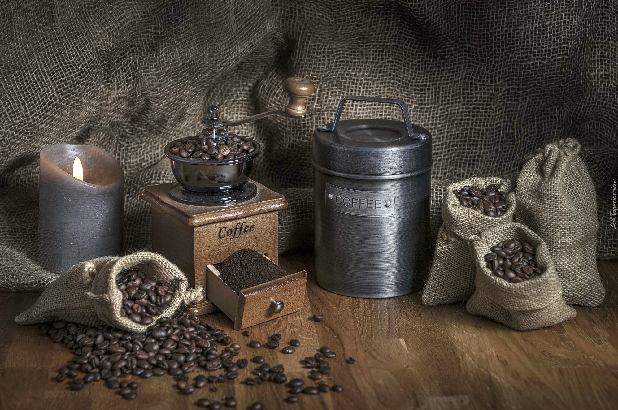 Edytor tapety: Kompozycja z ziaren kawy i świecy obok młynka