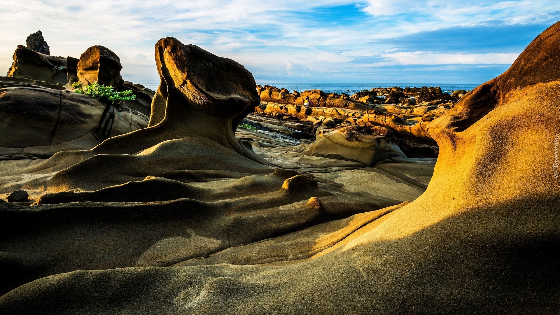 Edytor tapety: Rozświetlone skały nad morzem