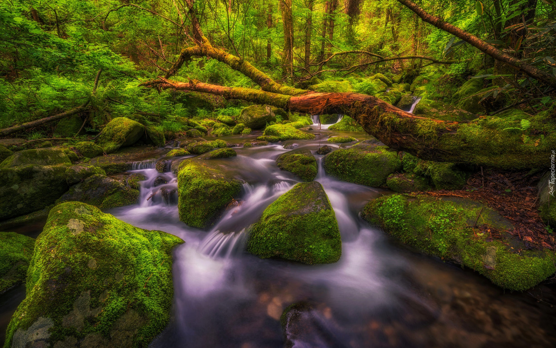 Edytor tapety: Powalone drzewa i omszałe kamienie na leśnej rzece