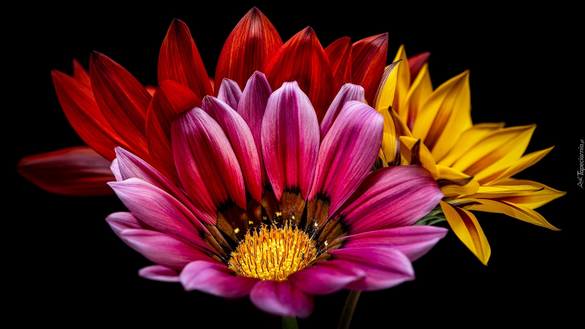 Edytor tapety: Kolorowe stokrotki afrykańskie na czarnym tle