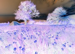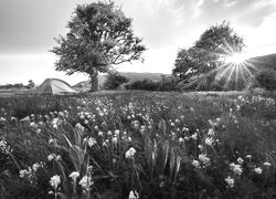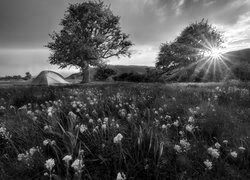Edytor tapety: Namiot pod drzewem na ukwieconej łące