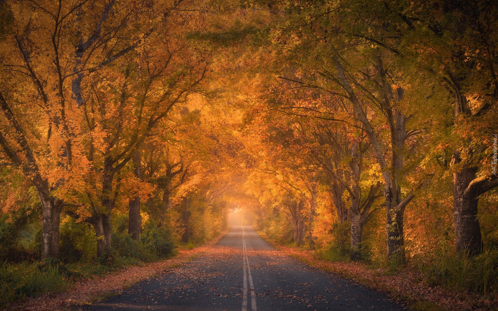 Edytor tapety: Jesienne drzewa po obu stronach asfaltowej drogi