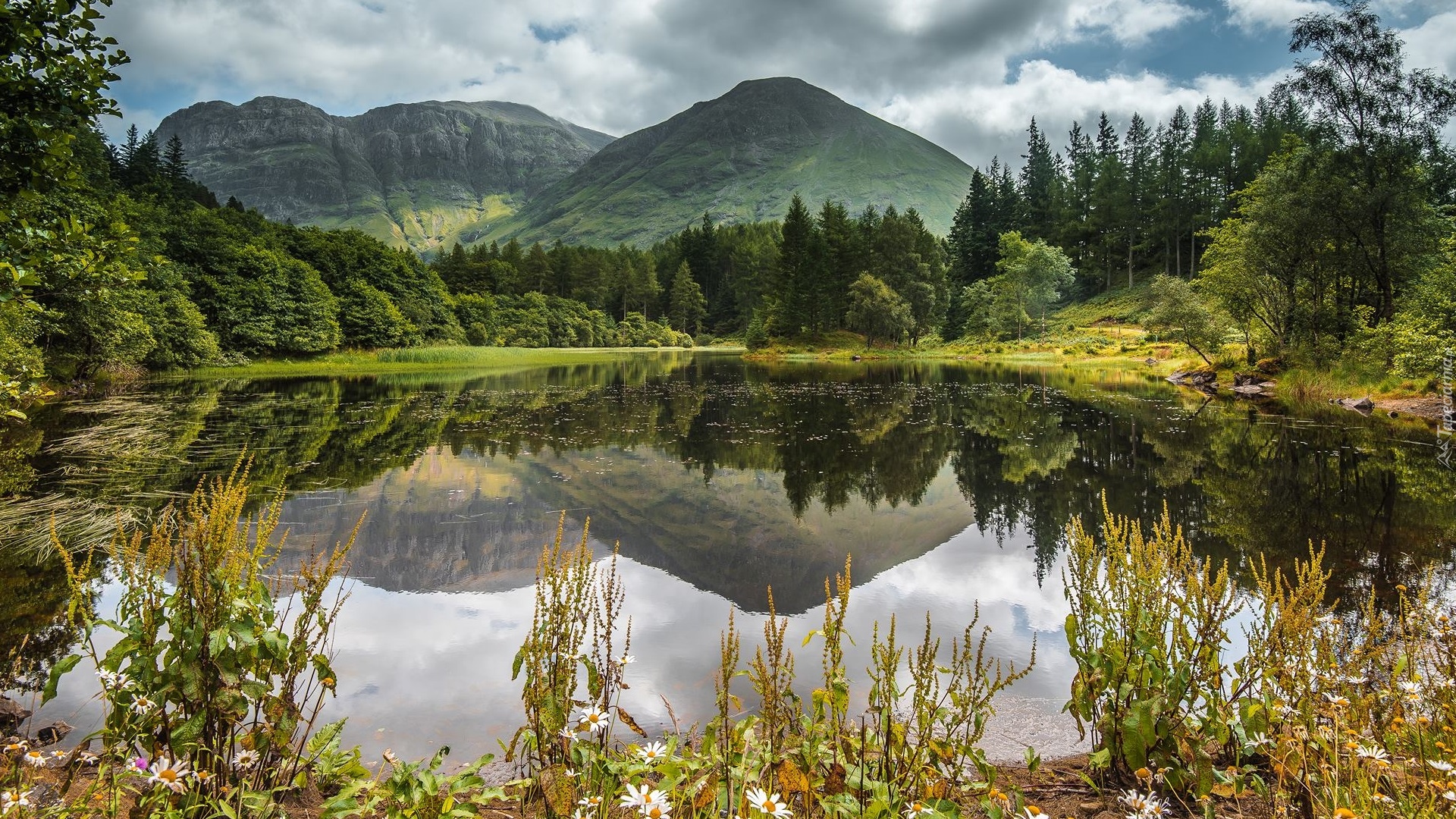 Edytor tapety: Odbicie gór i zielonego lasu w jeziorze