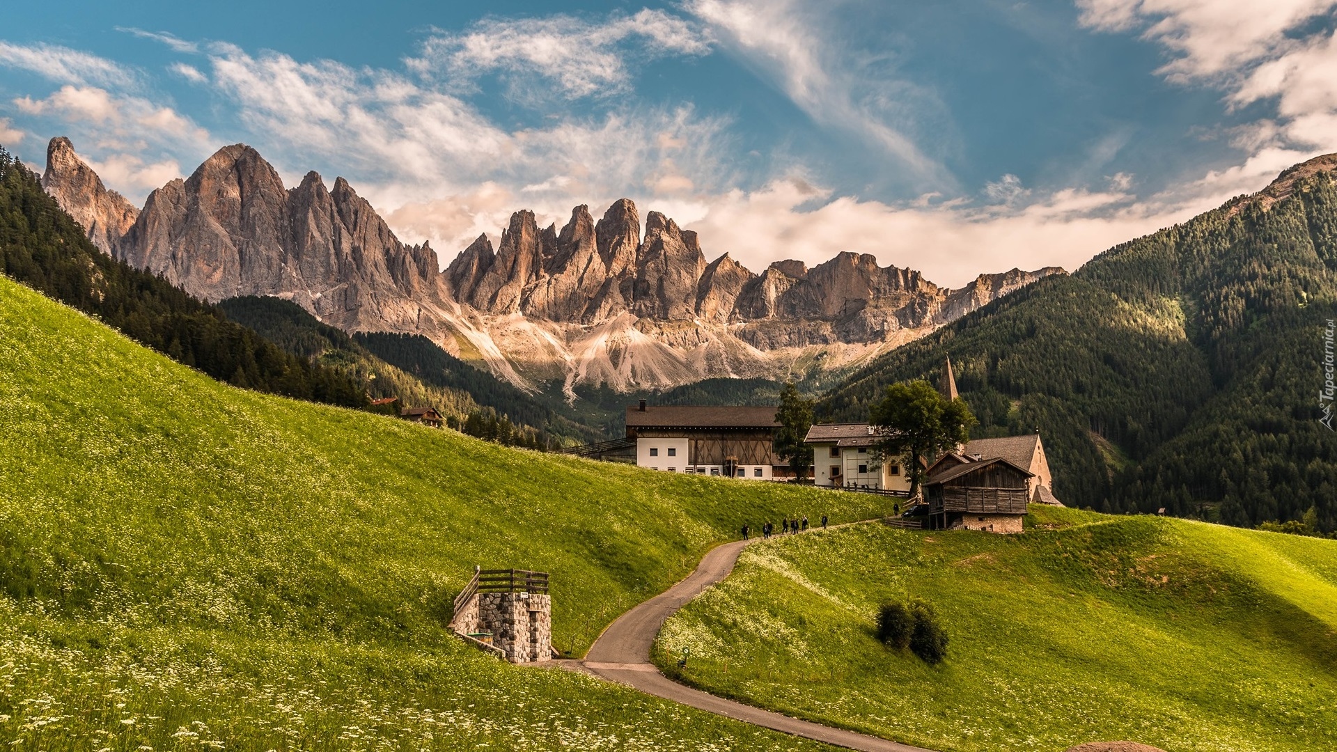 Edytor tapety: Droga do domów w dolinie na tle Dolomitów