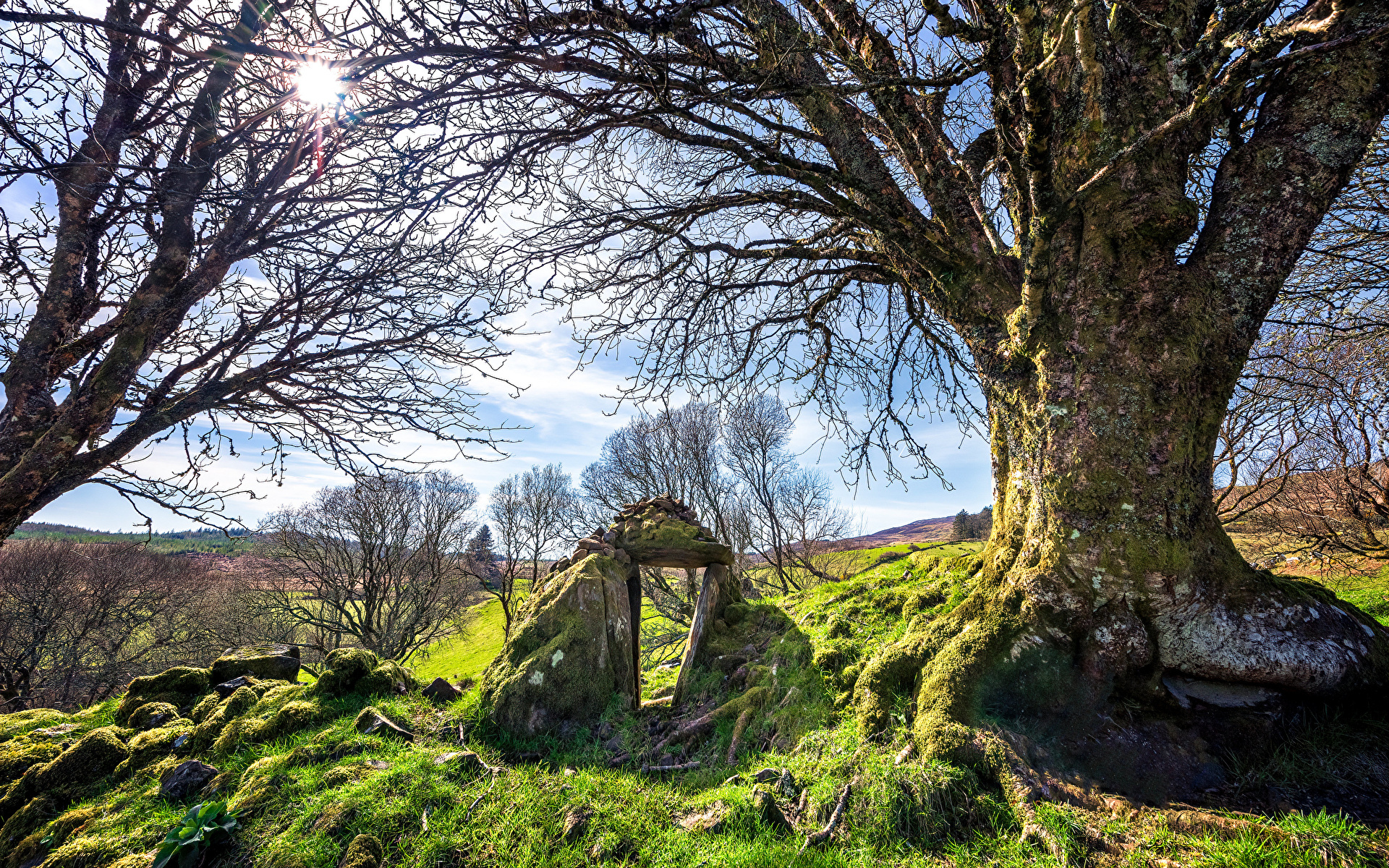 Edytor tapety: Omszone skały pod drzewem