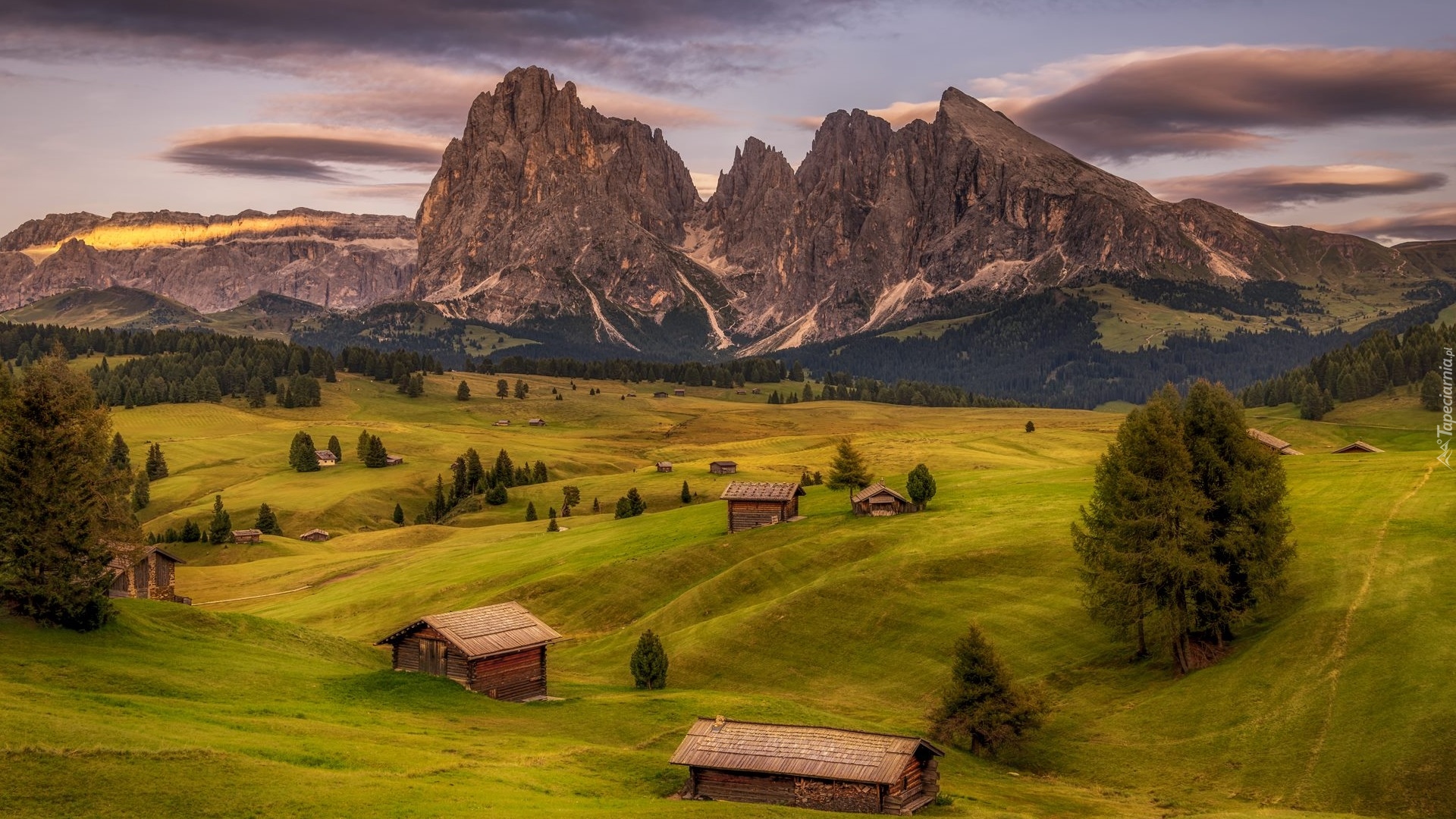Edytor tapety: Drewniane domy na płaskowyżu Seiser Alm w Dolomitach
