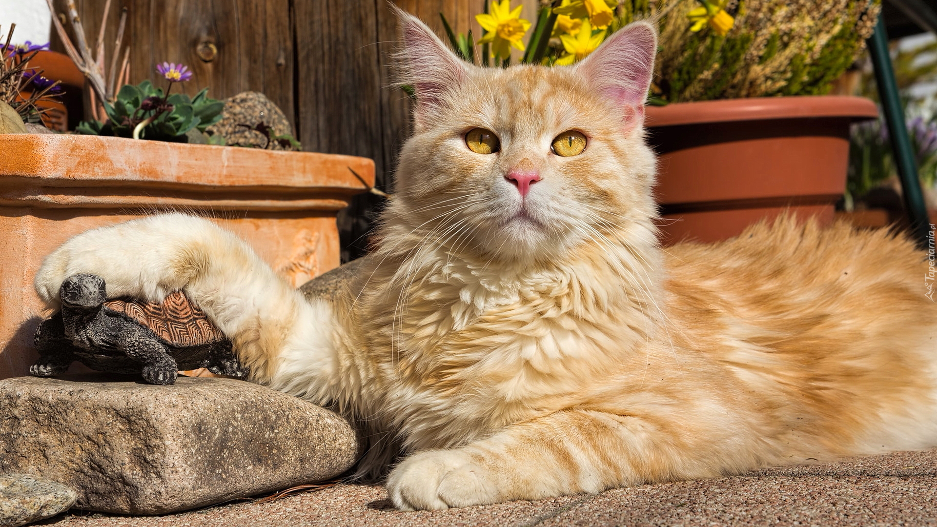 Edytor tapety: Rudawy kot z łapką na żółwiu