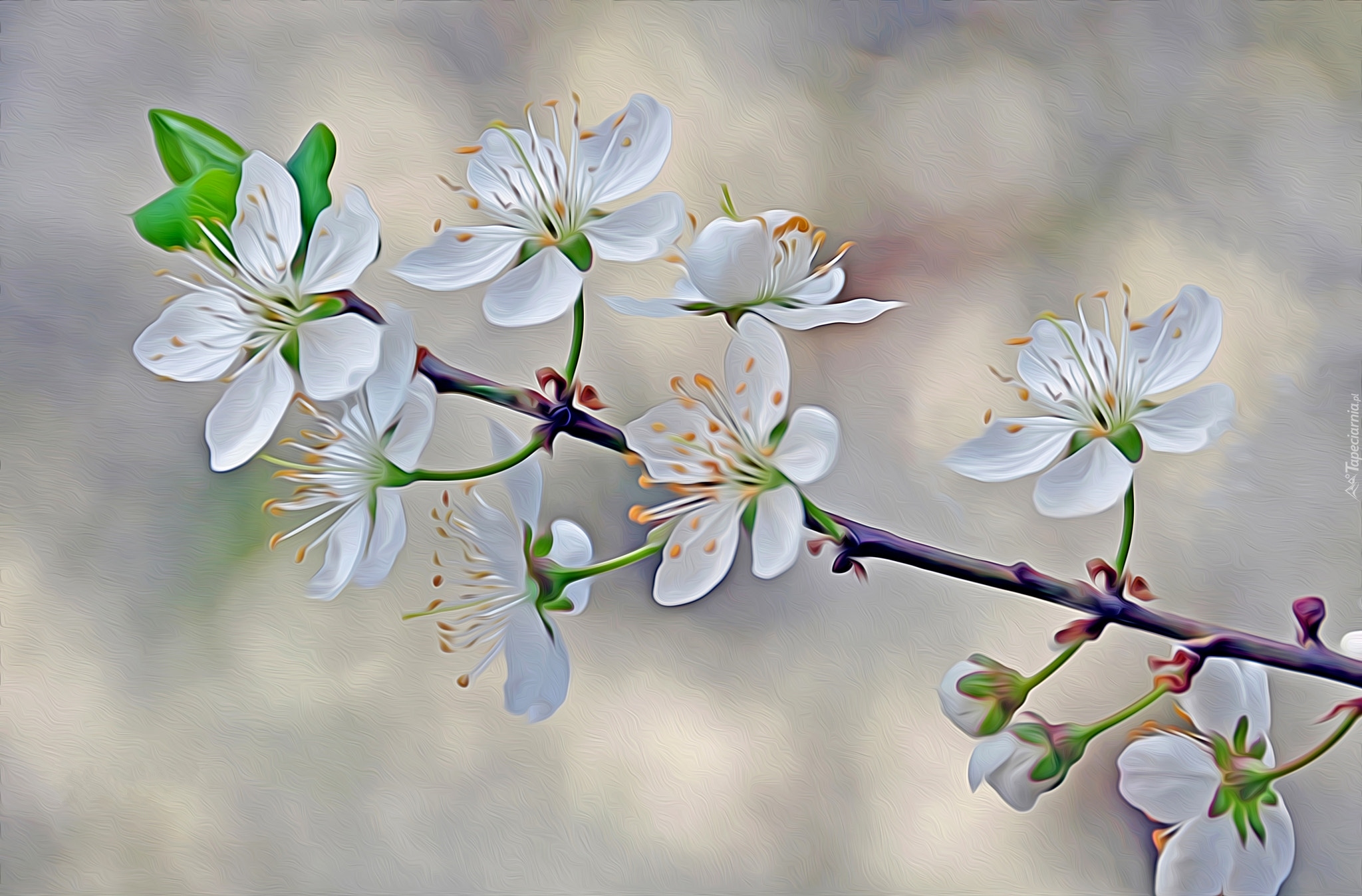 Edytor tapety: Gałązka drzewa owocowego z białymi kwiatami w grafice