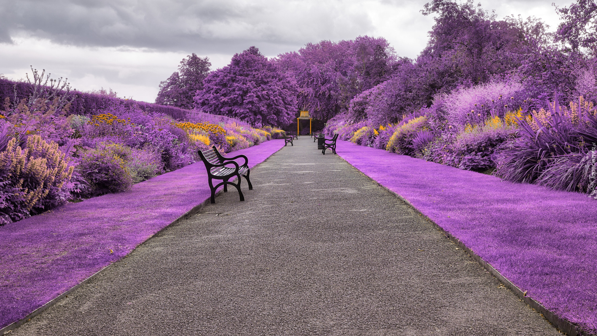 Edytor tapety: Ławki w alejce pośród fioletowych krzewów