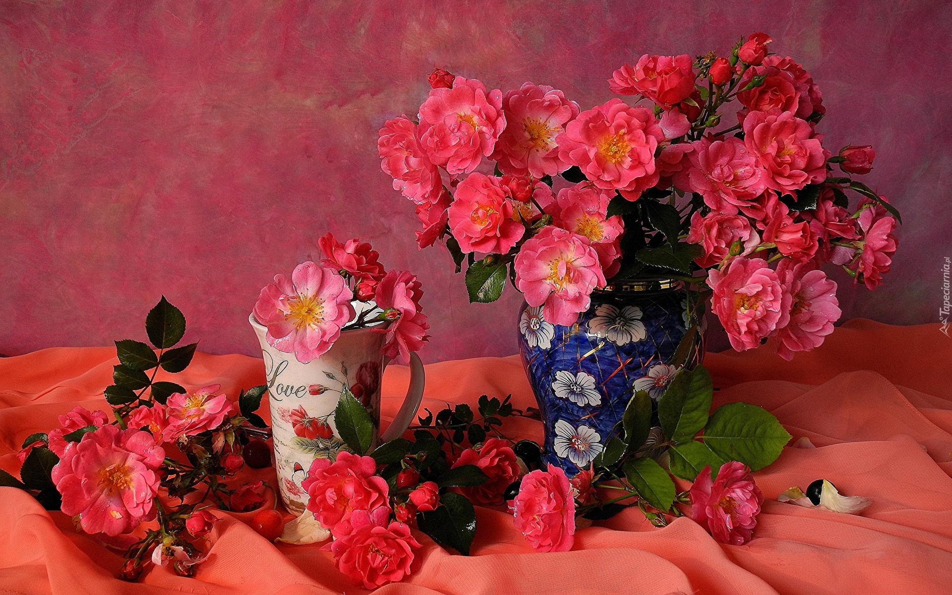 Edytor tapety: Różowe róże w kubku i wazonie
