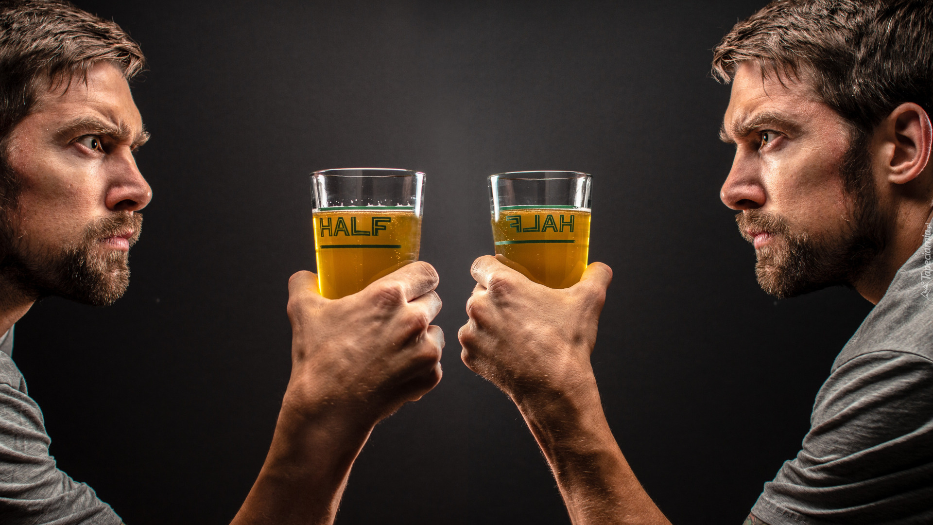 Edytor tapety: Lustrzane odbicie mężczyzny ze szklanką piwa w dłoni