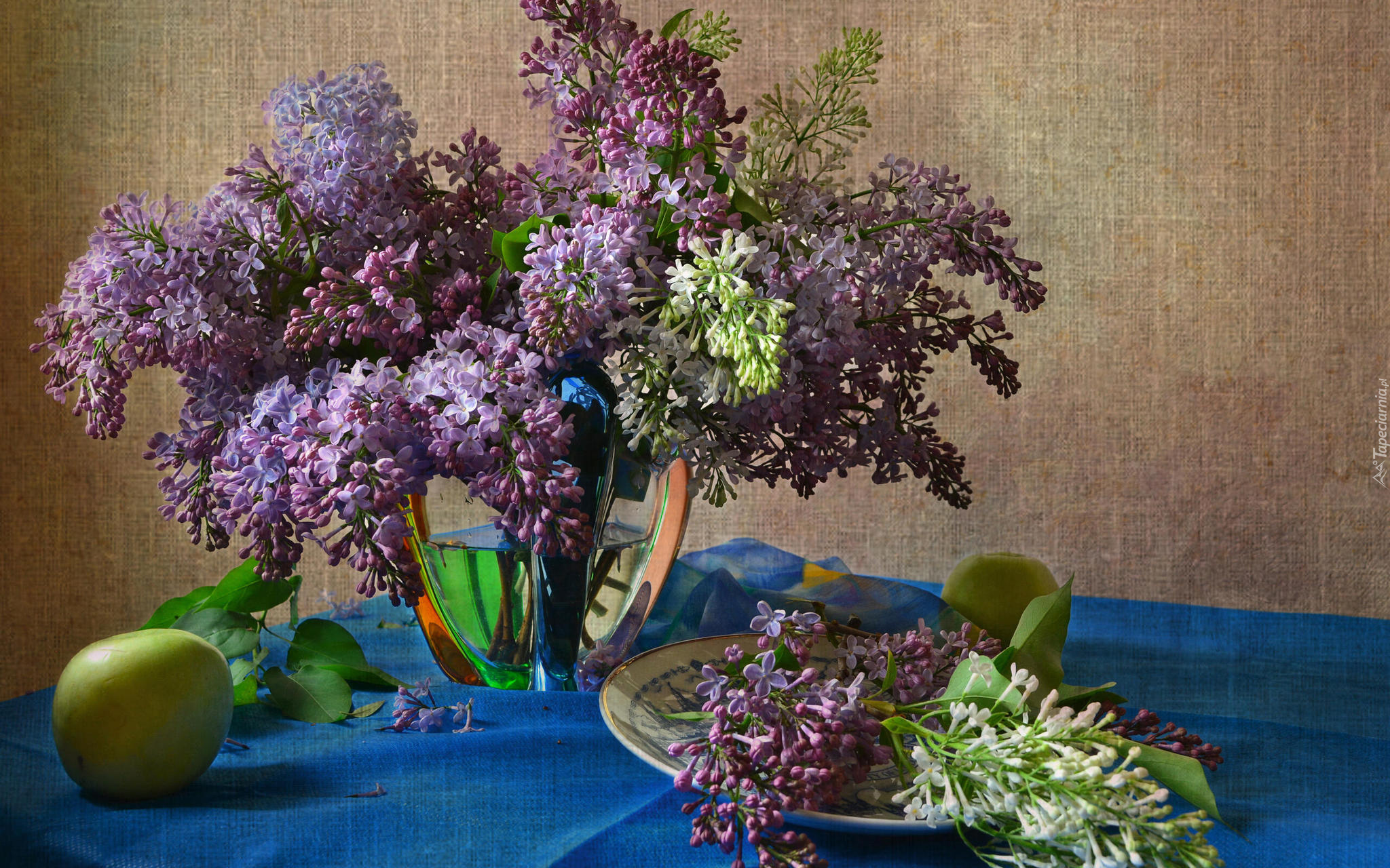 Edytor tapety: Bukiet bzu w szklanym wazonie obok jabłka