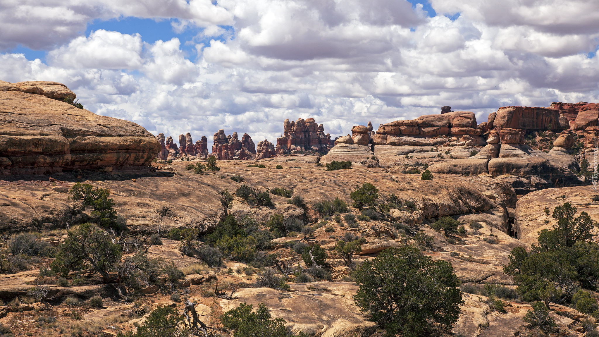 Edytor tapety: Zielone drzewa na tle skalnych formacji