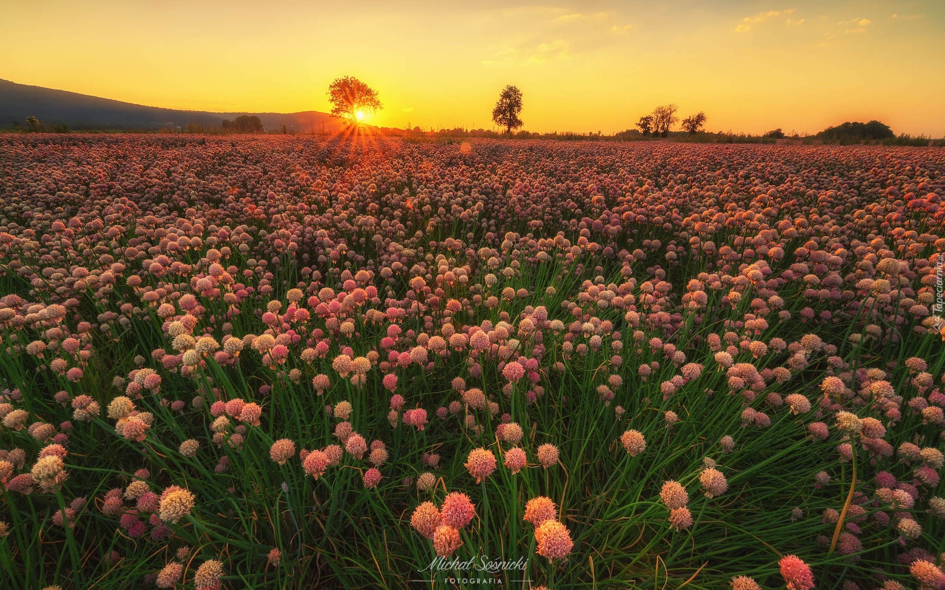 Edytor tapety: Wschód słońca nad polem kwitnącego szczypioru