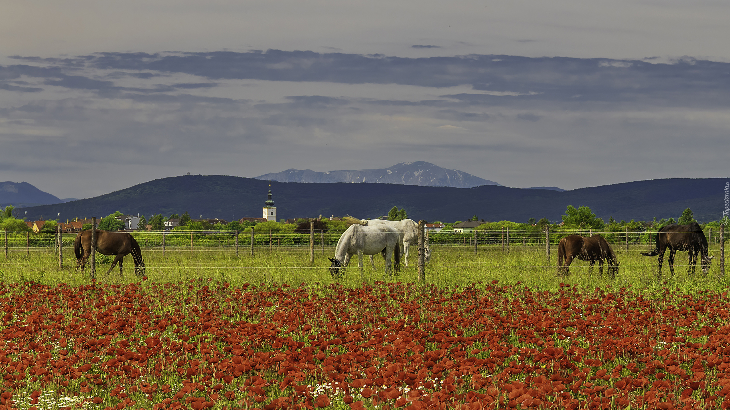 Edytor tapety: Konie pasące się na ogrodzonej łące