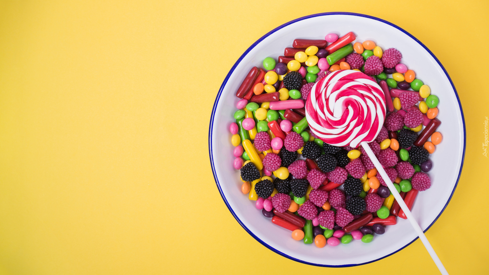 Edytor tapety: Lizak i kolorowe cukierki na talerzu