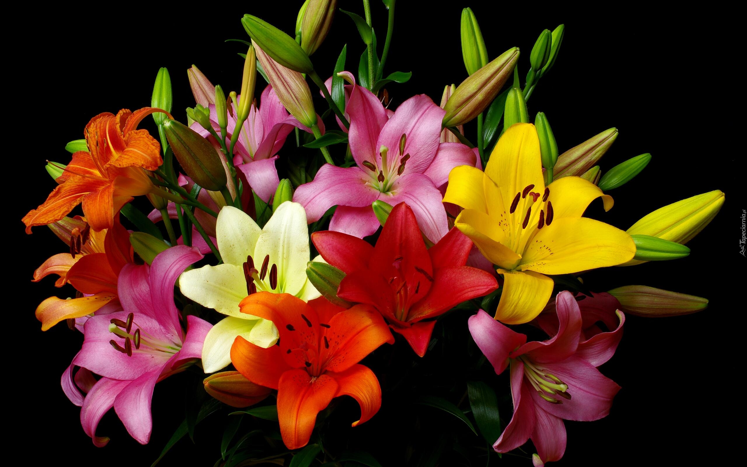 Edytor tapety: Kolorowe lilie w bukiecie na ciemnym tle