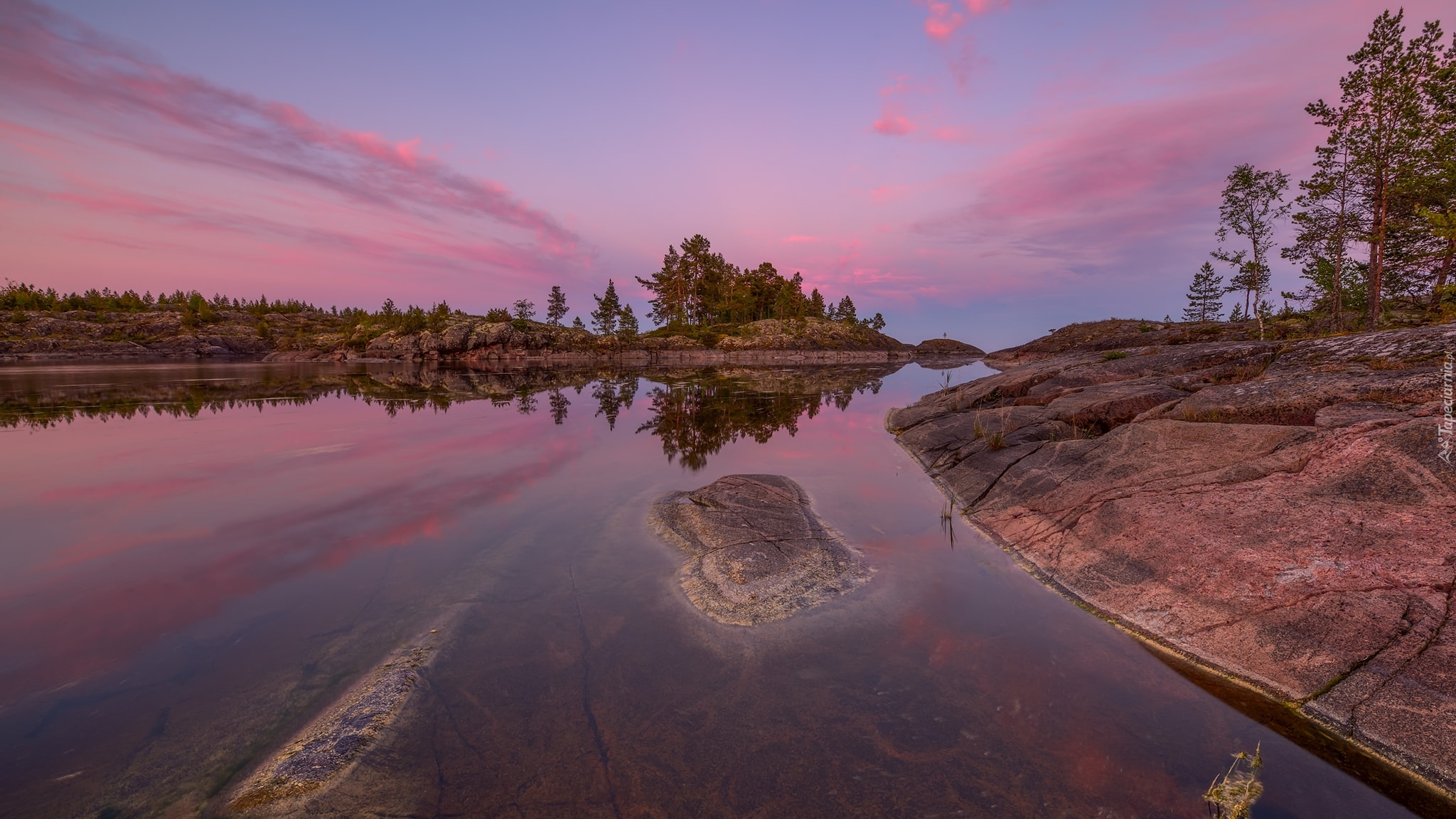 Edytor tapety: Skały i drzewa nad jeziorem