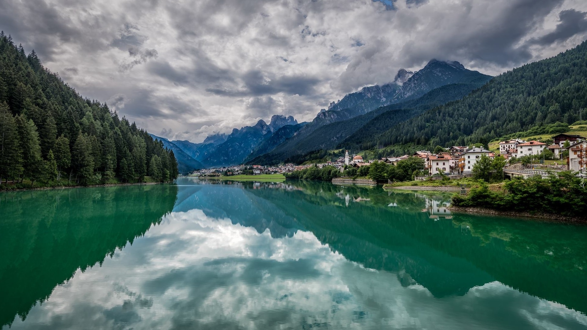 Edytor tapety: Domy na brzegu górskiego jeziora