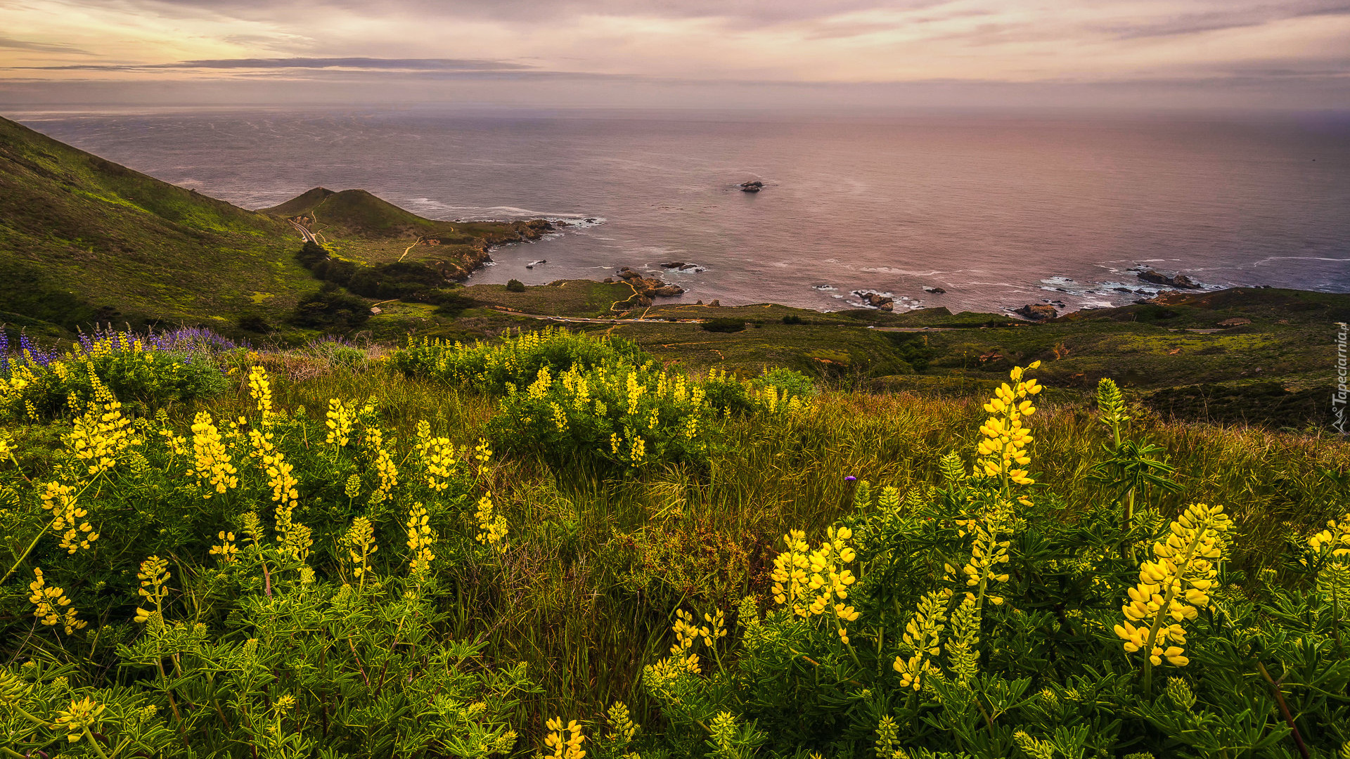 Edytor tapety: Żółty łubin na wzgórzu nad morzem