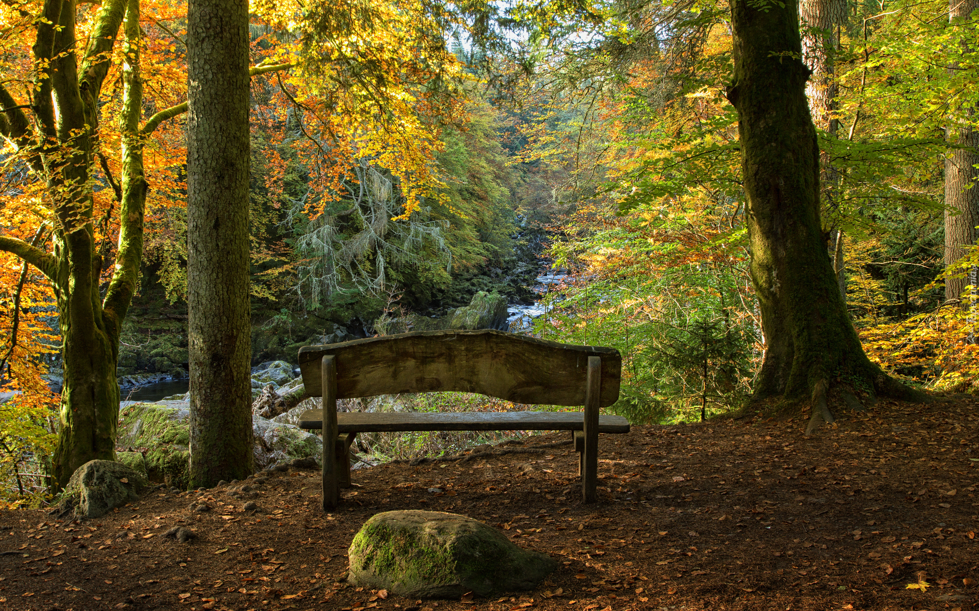 Edytor tapety: Ławka pośród jesiennych drzew nad leśnym strumieniem