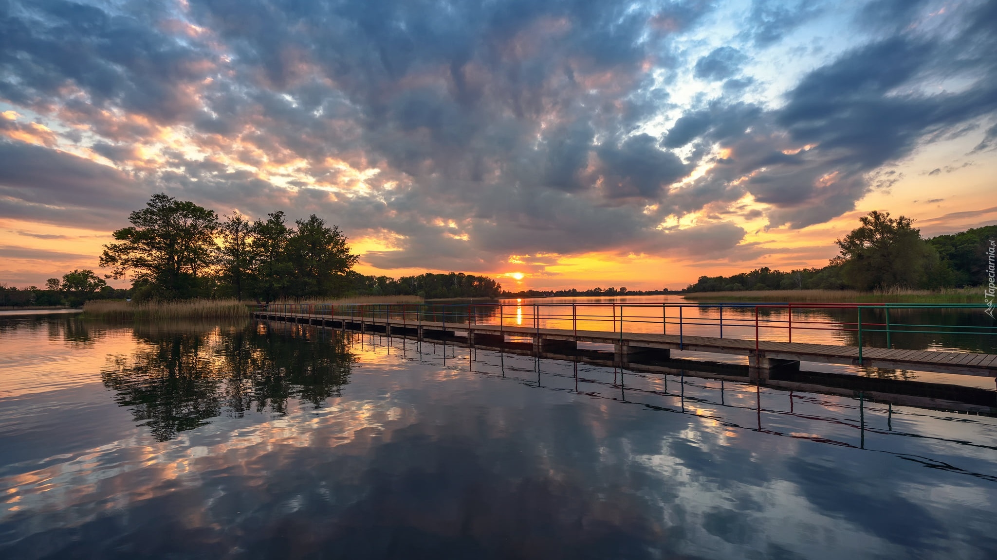 Edytor tapety: Mostek na jeziorze o zachodzie słońca
