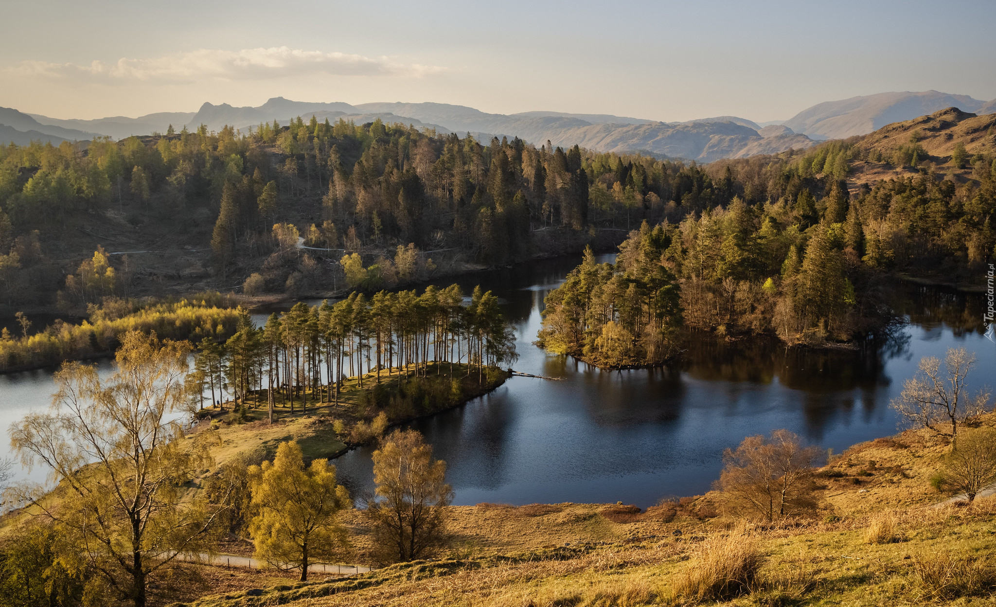 Edytor tapety: Wysepki z drzewami na jeziorze w górach