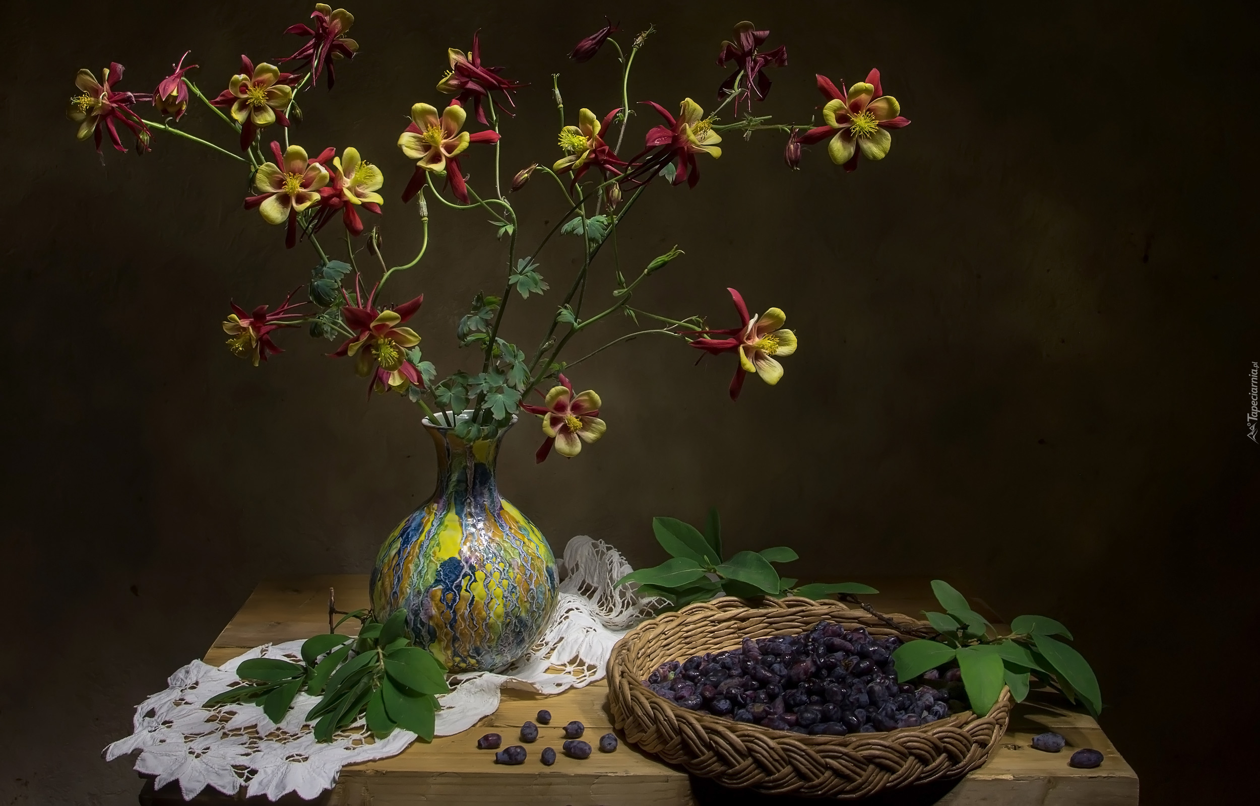 Edytor tapety: Kwiaty w wazonie obok koszyczka z owocami