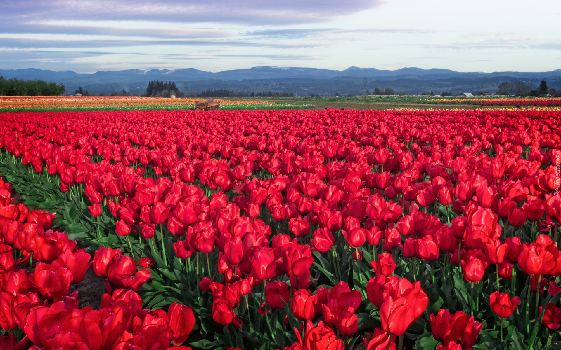 Edytor tapety: Plantacja czerwonych tulipanów na tle gór