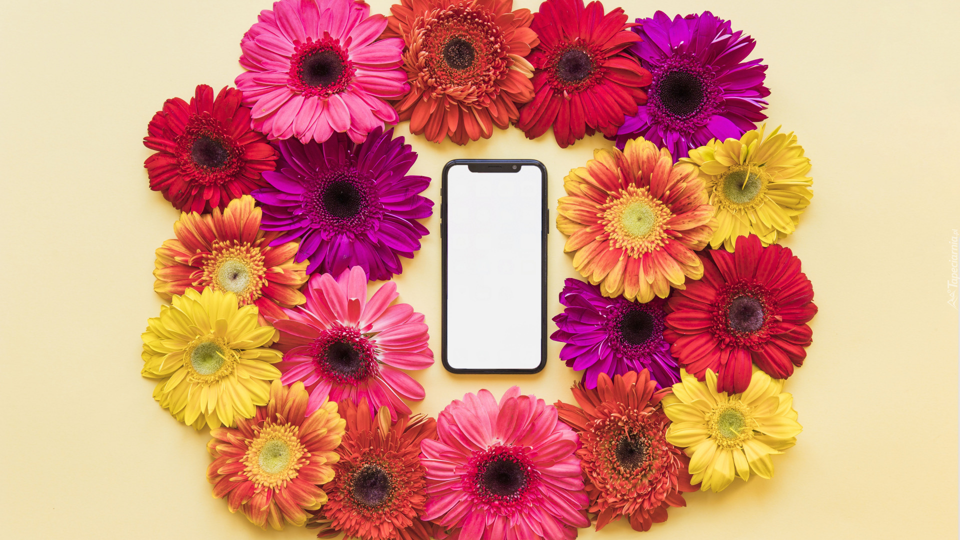 Edytor tapety: Kolorowe gerbery wokół telefonu komórkowego