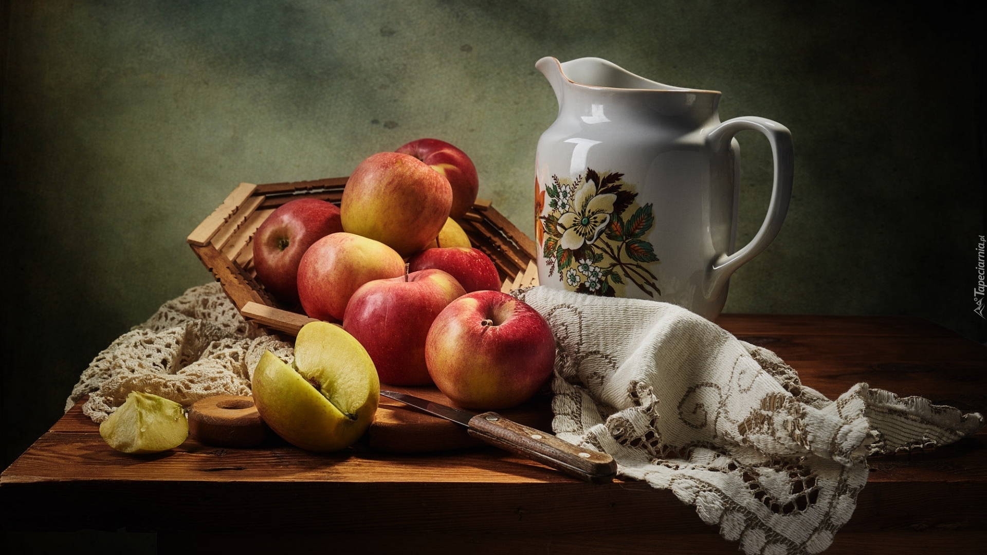Edytor tapety: Jabłka w koszyku obok porcelanowego dzbanka