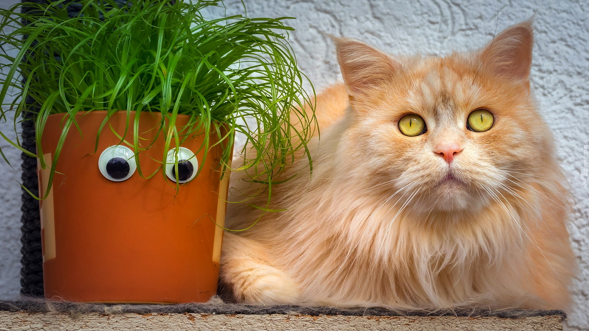 Edytor tapety: Rudy kot obok doniczki z trawą