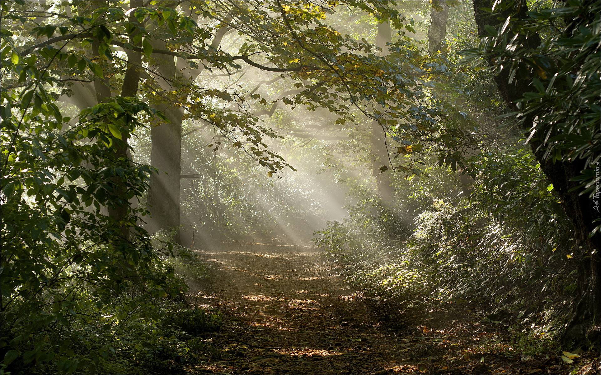 Edytor tapety: Smugi słońca wśród drzew przy leśnej ścieżce