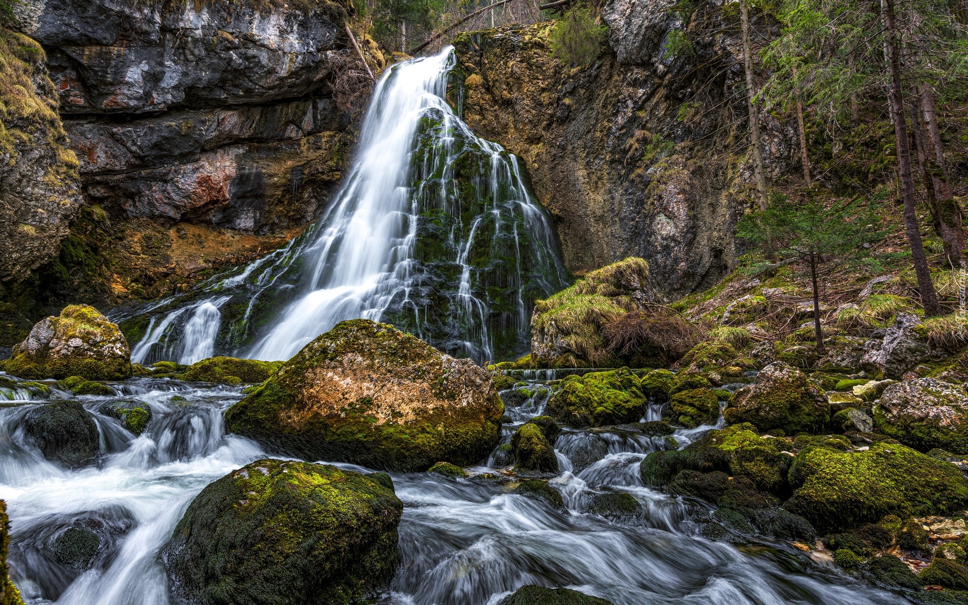 Edytor tapety: Omszałe kamienie na rzece przy leśnym wodospadzie