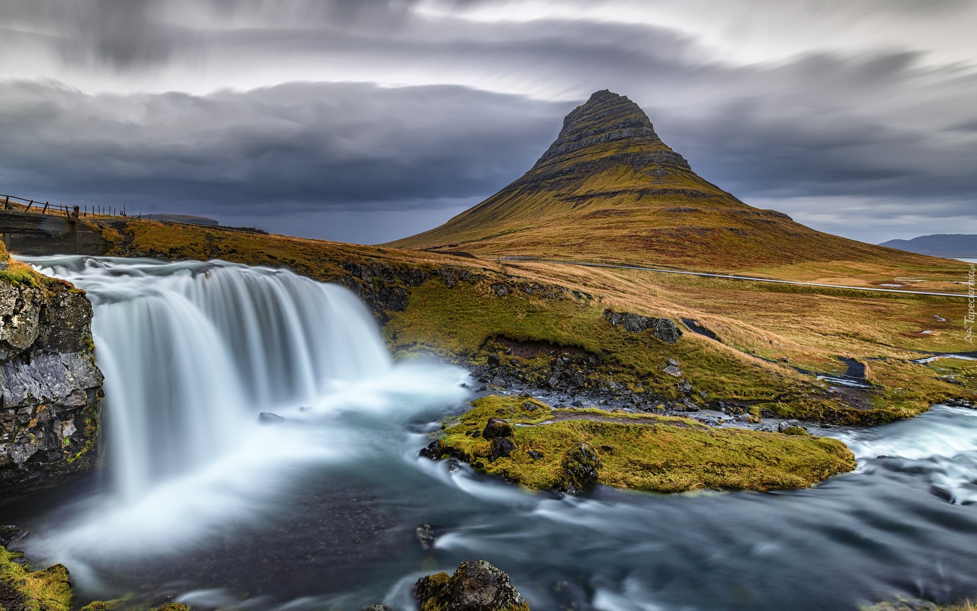 Edytor tapety: Wodospad Kirkjufellsfoss na tle góry Kirkjufell w Islandii