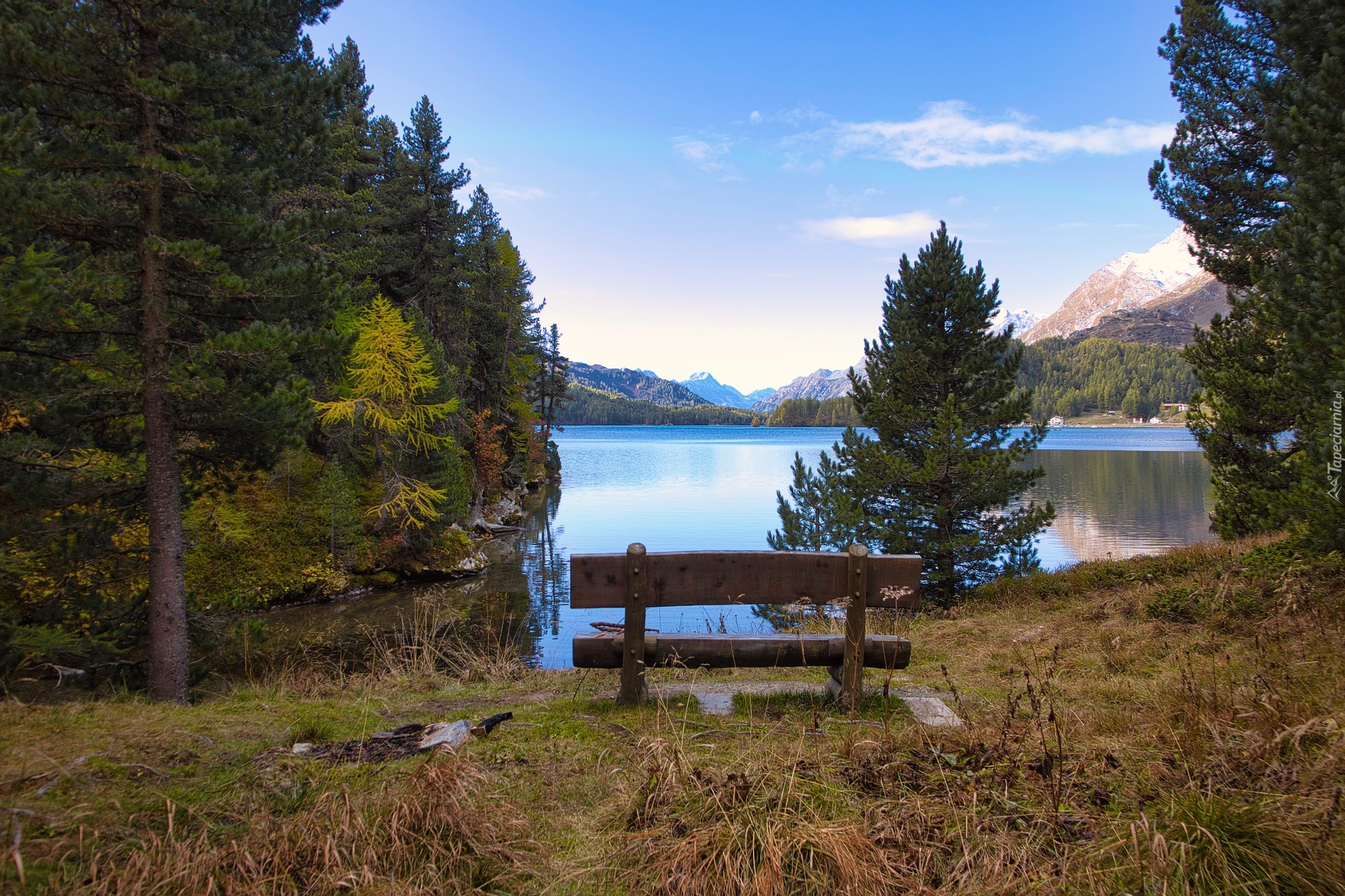 Edytor tapety: Ławeczka nad jeziorem w górach