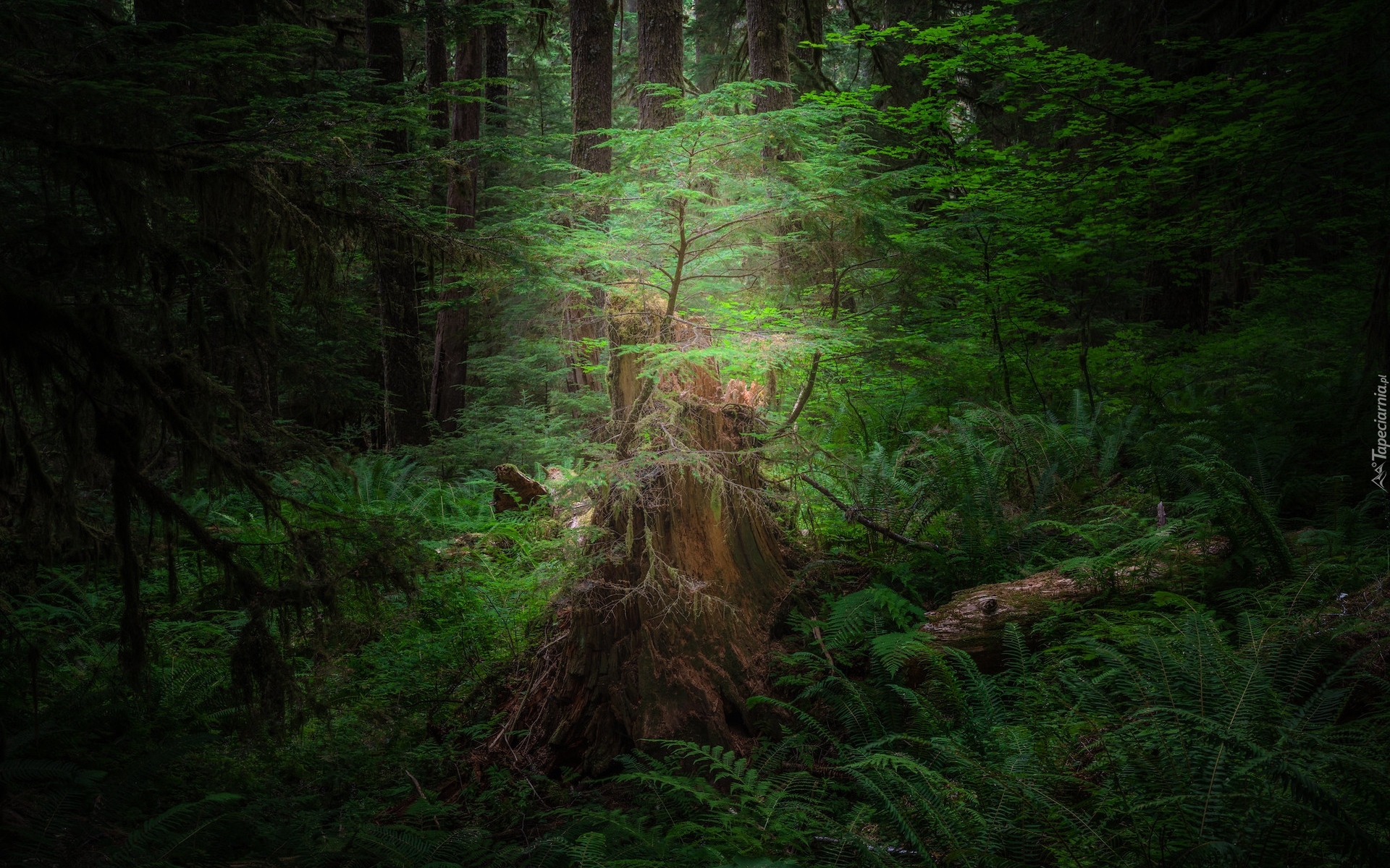 Edytor tapety: Paprocie wokół spróchniałych pni w lesie