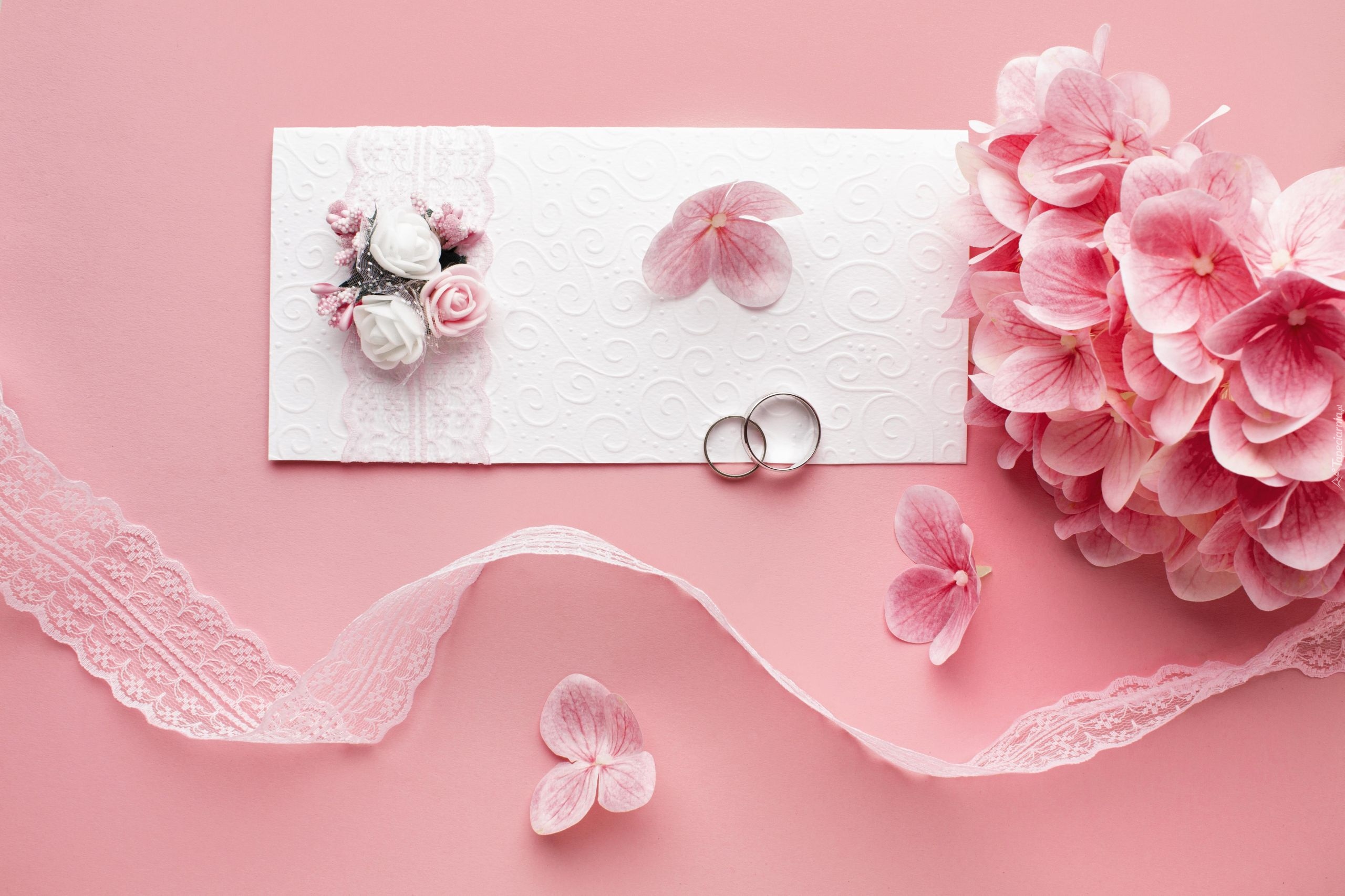 Edytor tapety: Hortensje obok obrączek na zaproszeniu ślubnym