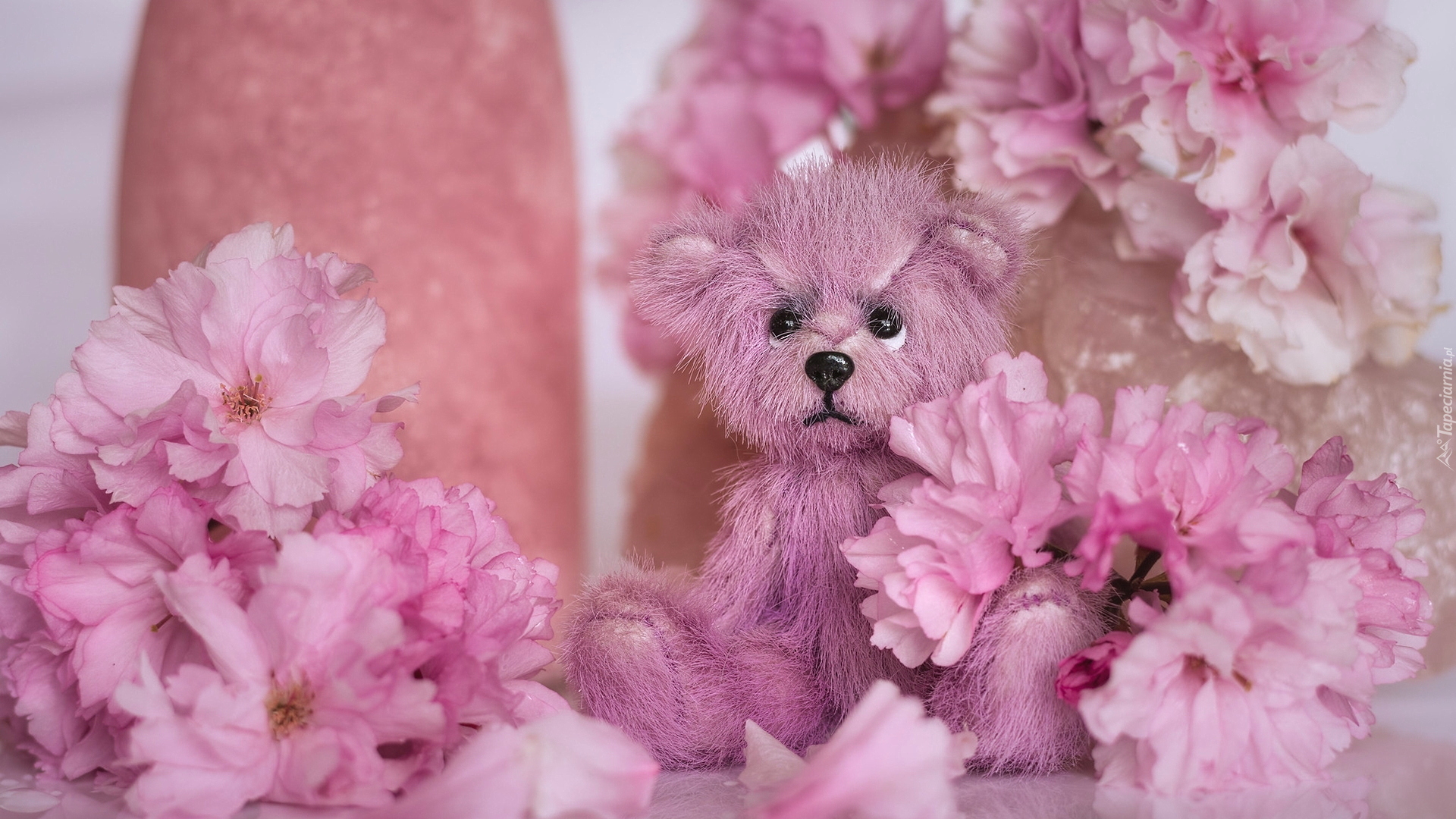 Edytor tapety: Smutny miś pośród różowych kwiatów