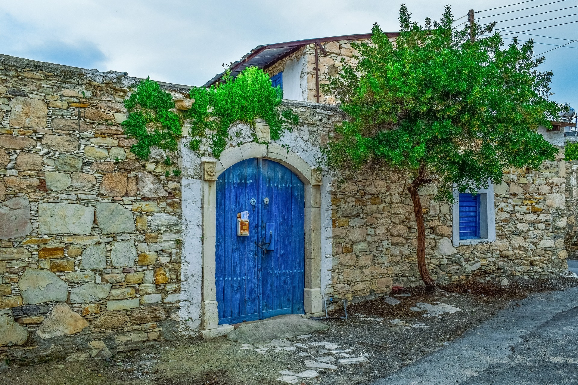 Edytor tapety: Drzewo przy kamiennym domu z niebieską bramą