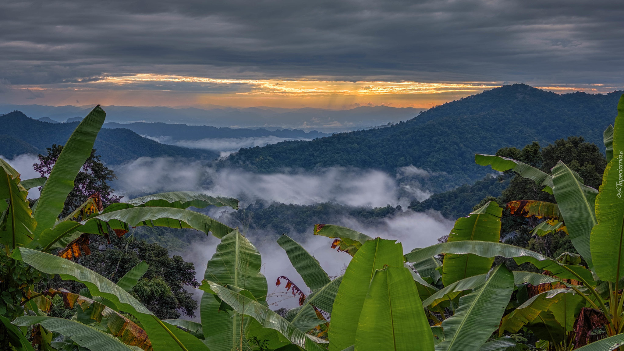 Edytor tapety: Mgła nad zalesionymi górami