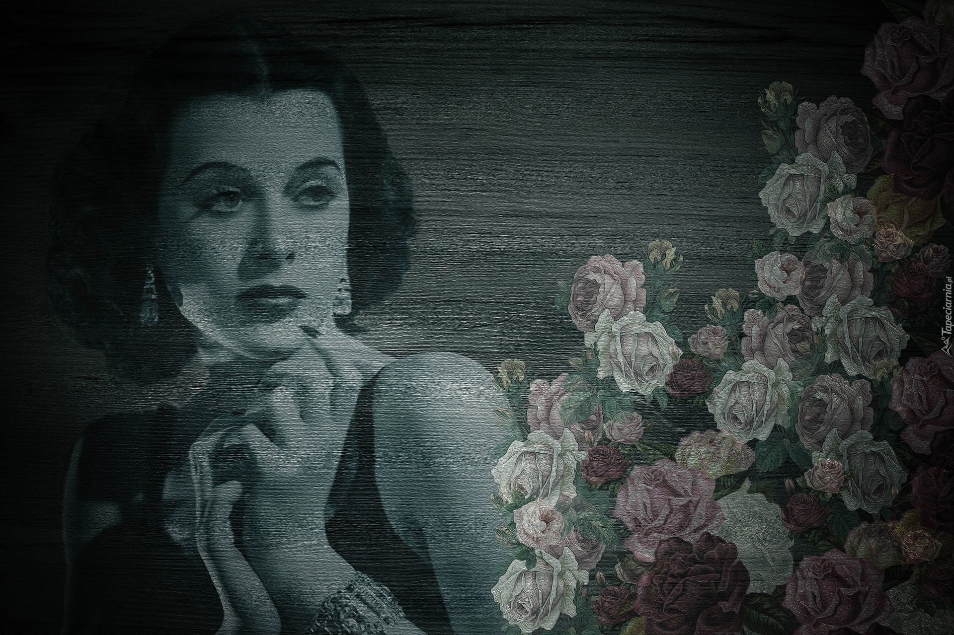 Edytor tapety: Hedy Lamarr obok róż na drewnie