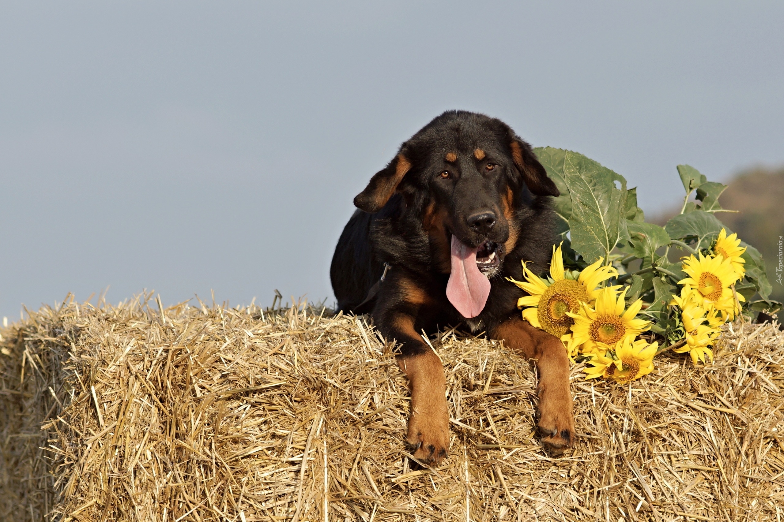 Edytor tapety: Mastif obok słoneczników na sianie