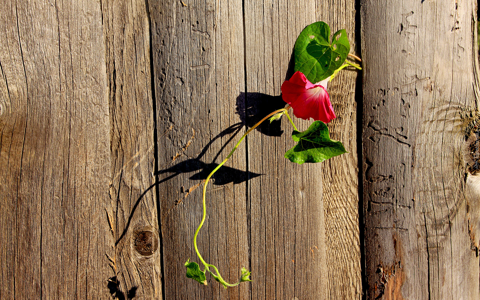 Edytor tapety: Czerwony kwiat powoju na drewnianym płocie