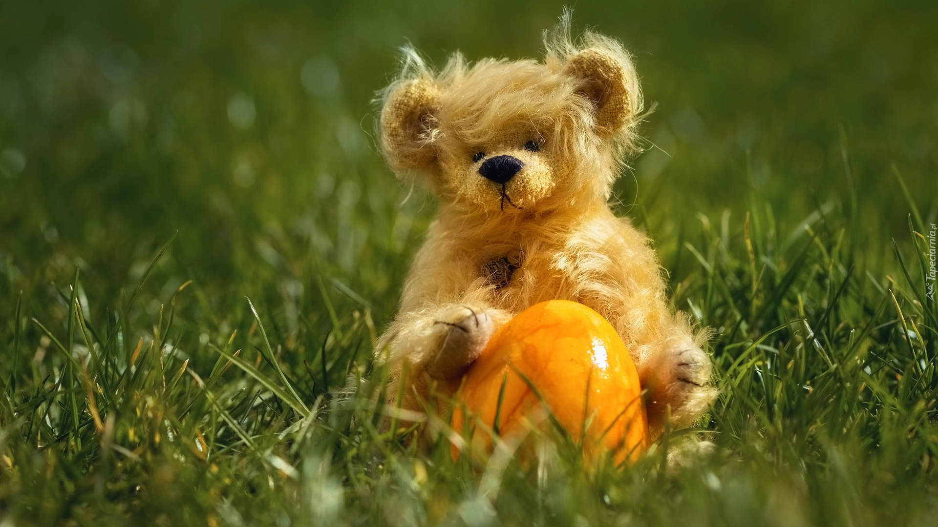 Edytor tapety: Pluszowy miś z pisanką na trawie
