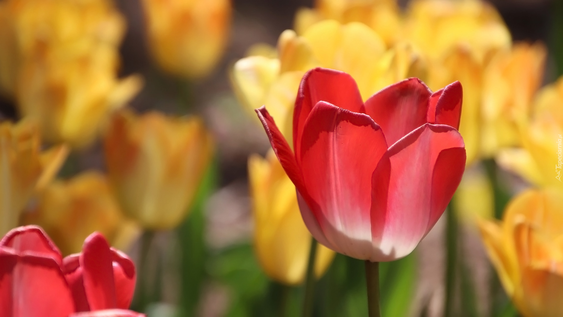 Edytor tapety: Czerwony tulipan na tle żółtych kwiatów