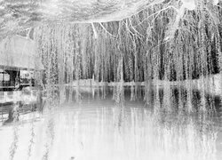 Edytor tapety: Zwisające gałęzie wierzby przy domu na palach na jeziorze