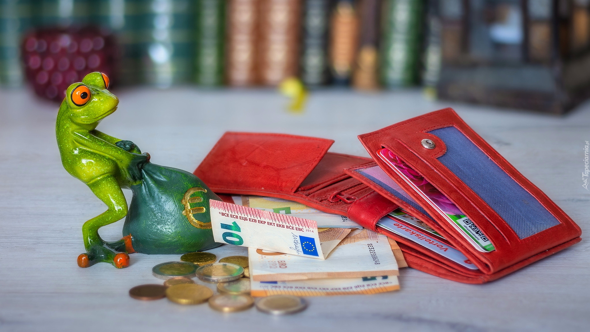 Edytor tapety: Figurka żaby obok portfela z pieniędzmi